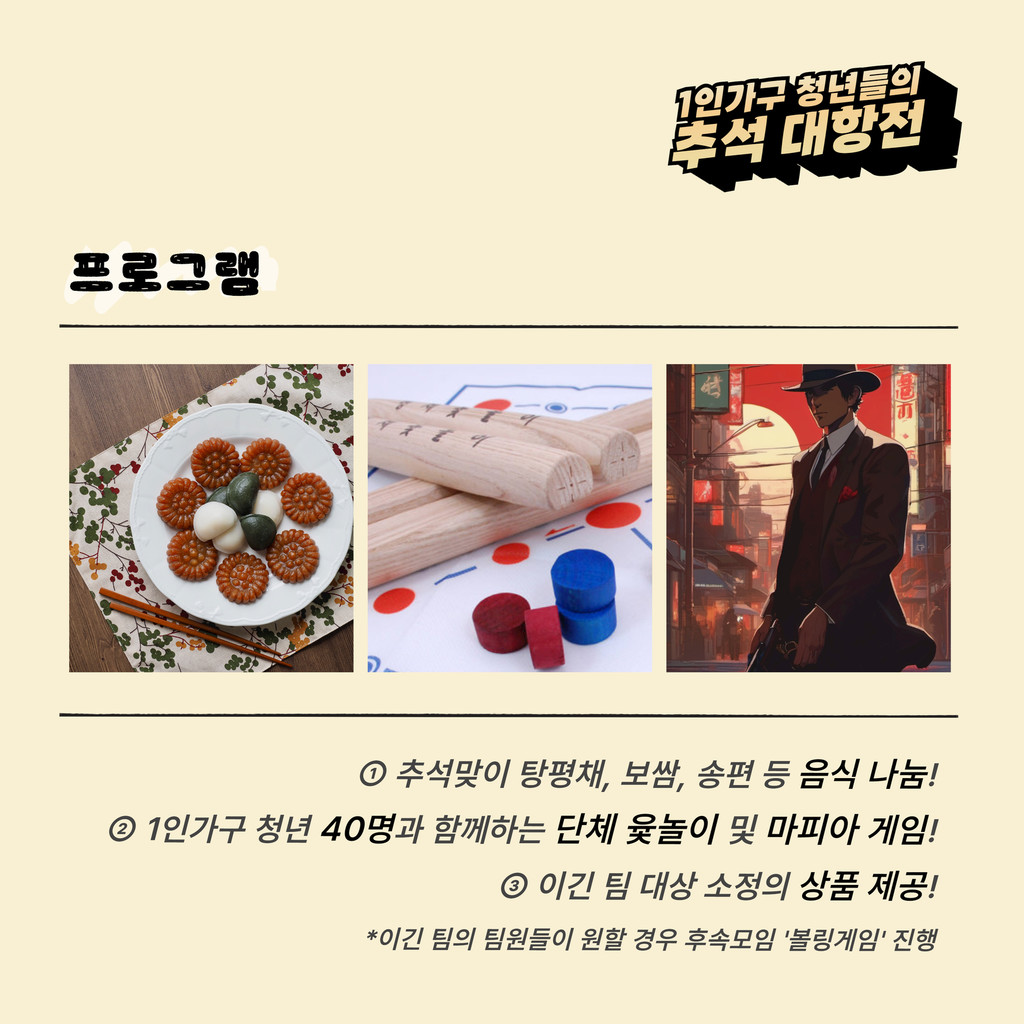청년 (최대)40명이 함께 단체 "윷놀이 & 마피아게임"을 진행합니다.