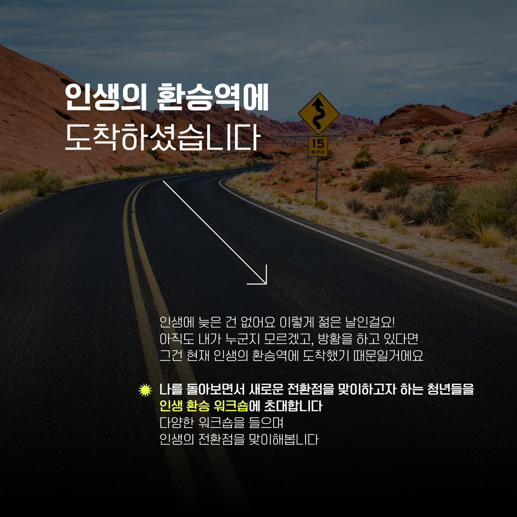 나를 돌아보고 새로운 전환점을 맞이하고자 하는 청년분들을 인생 환승 워크숍에 초대합니다.