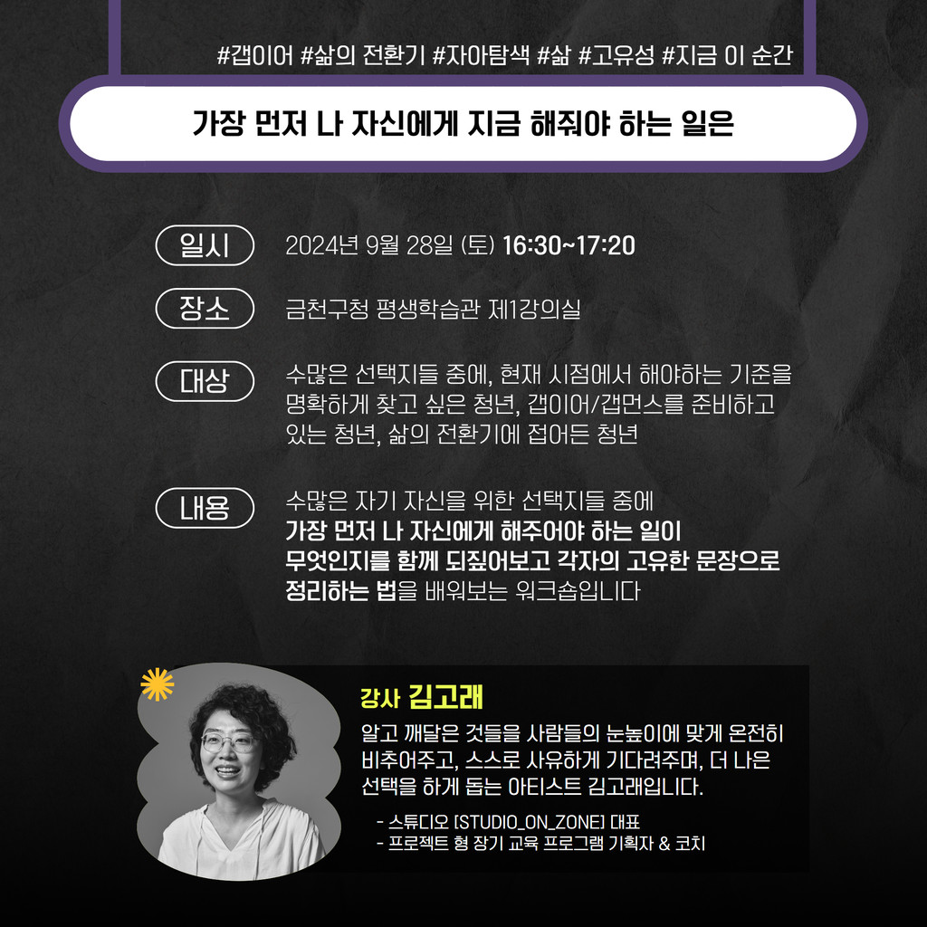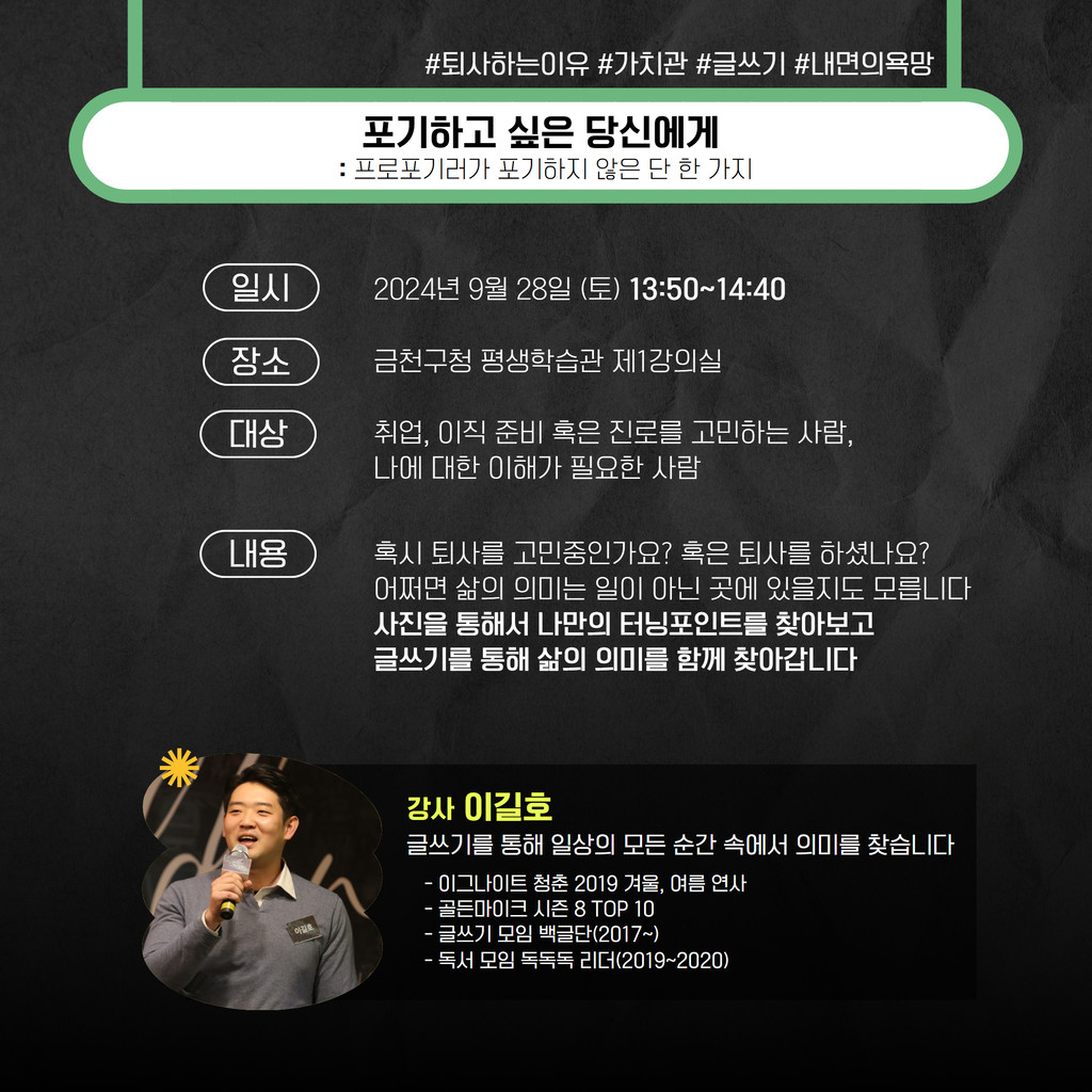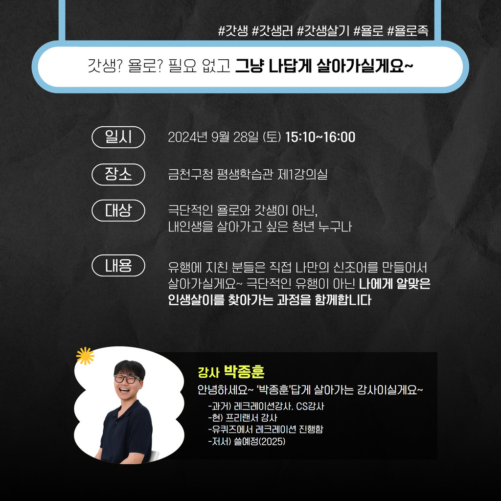 - 시간 : 15:10~16:00- 내용 : 유행에 지친 분들은 직접 나만의 신조어를 만들어서 살아가실게요~- 대상 : 극단적인 욜로와 갓생이 아닌, 내인생을 살아가고 싶은 청년 누구나- 강사 : 박종훈