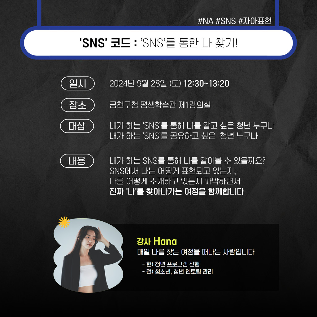 - 내용 : 일상에서 사용하는 SNS를 통해 나를 알아가는 강의입니다.