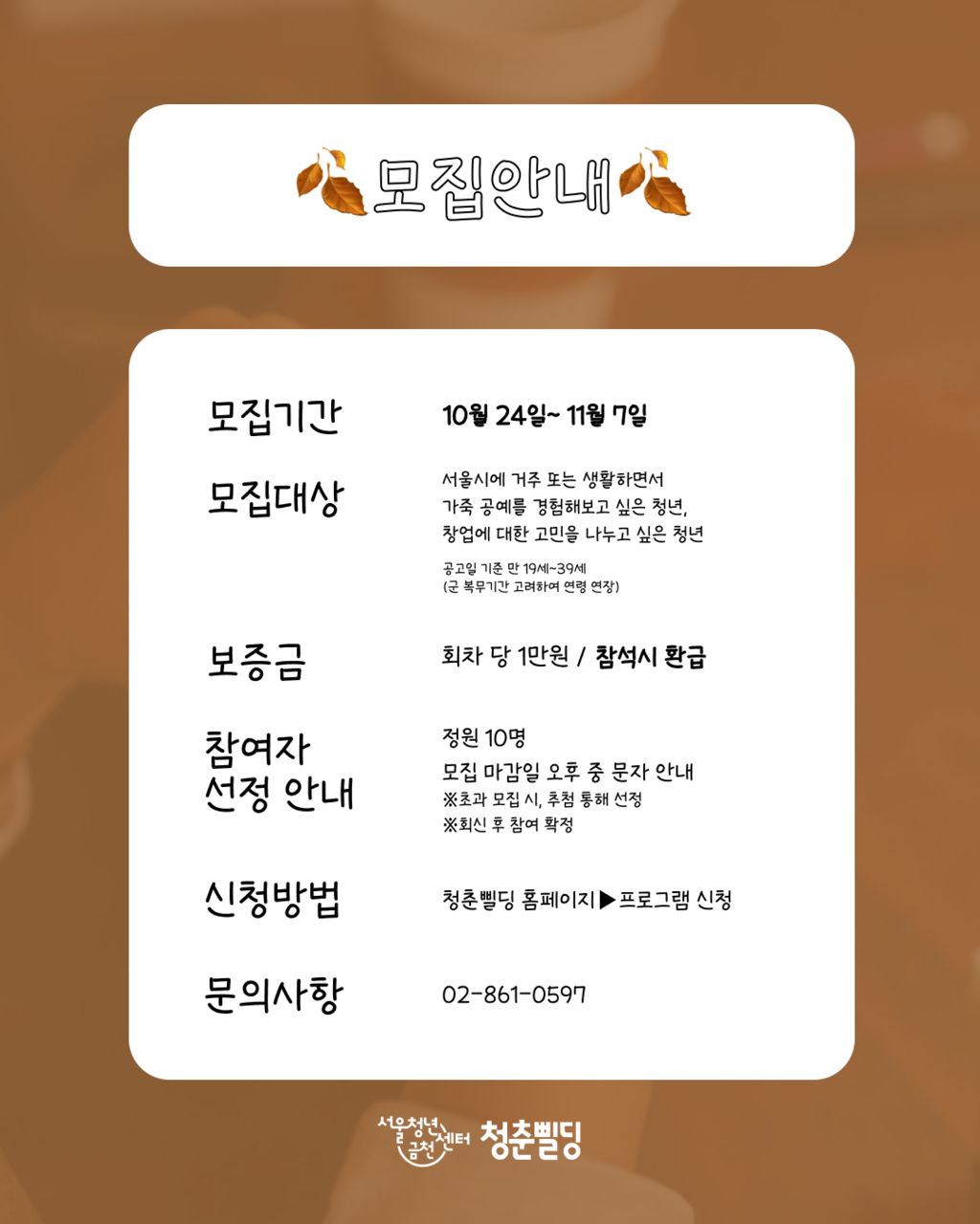 - 신청방법: 청춘삘딩 홈페이지 로그인-> 기관소개-> 프로그램 신청