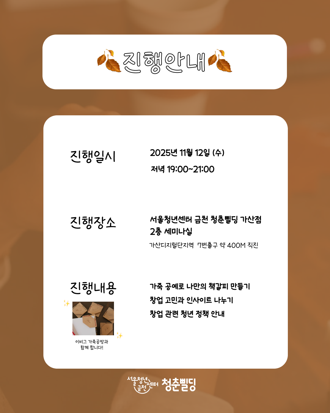 두 번째 11월 두시티톡 <손끝으로 만드는 가을 책갈피- 가죽 공예 & 창업 인사이트 공유 워크샵>을 추천드립니다!