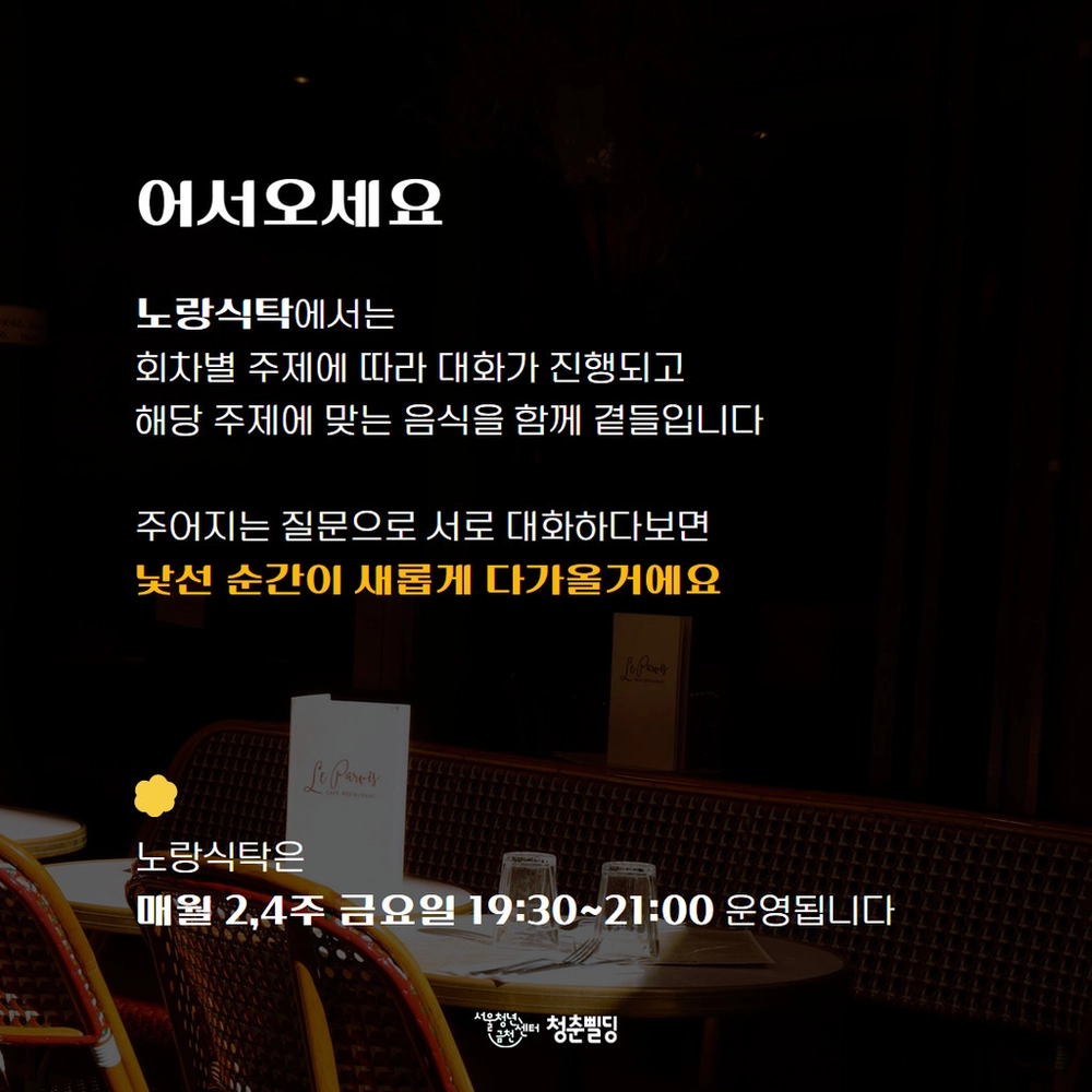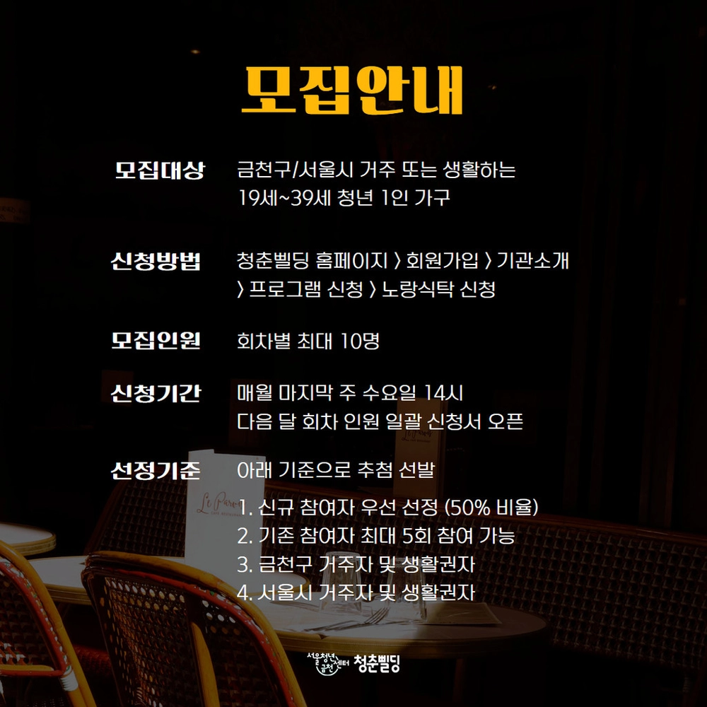 *노랑식탁 참여자는 프로그램이 있는 주의 수요일 17시까지 신청한 사람 중, 아래 기준으로 선정됩니다. 선착순 모집이 아니므로 양해부탁드립니다.