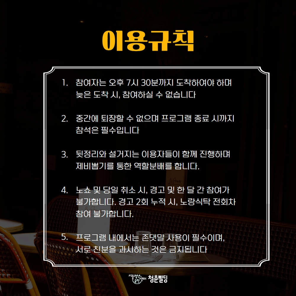 1. 참여자는 오후 7시 30분까지 도착하여야 하며 늦은 도착 시, 참여하실 수 없습니다 2. 중간에 퇴장할 수 없으며 프로그램 종료 시까지 참석은 필수입니다 3. 뒷정리와 설거지는 참여자들이 함께 진행하며 제비뽑기를 통한 역할분배를 합니다. 4. 노쇼 및 당일 취소 시, 경고 및 한 달 간 참여가 불가합니다. 경고 2회 누적 시, 노랑식탁 전회차 참여 불가합니다. 5. 프로그램 내에서는 존댓말 사용이 필수이며, 서로 친분을 과시하는 것은 금지됩니다 |