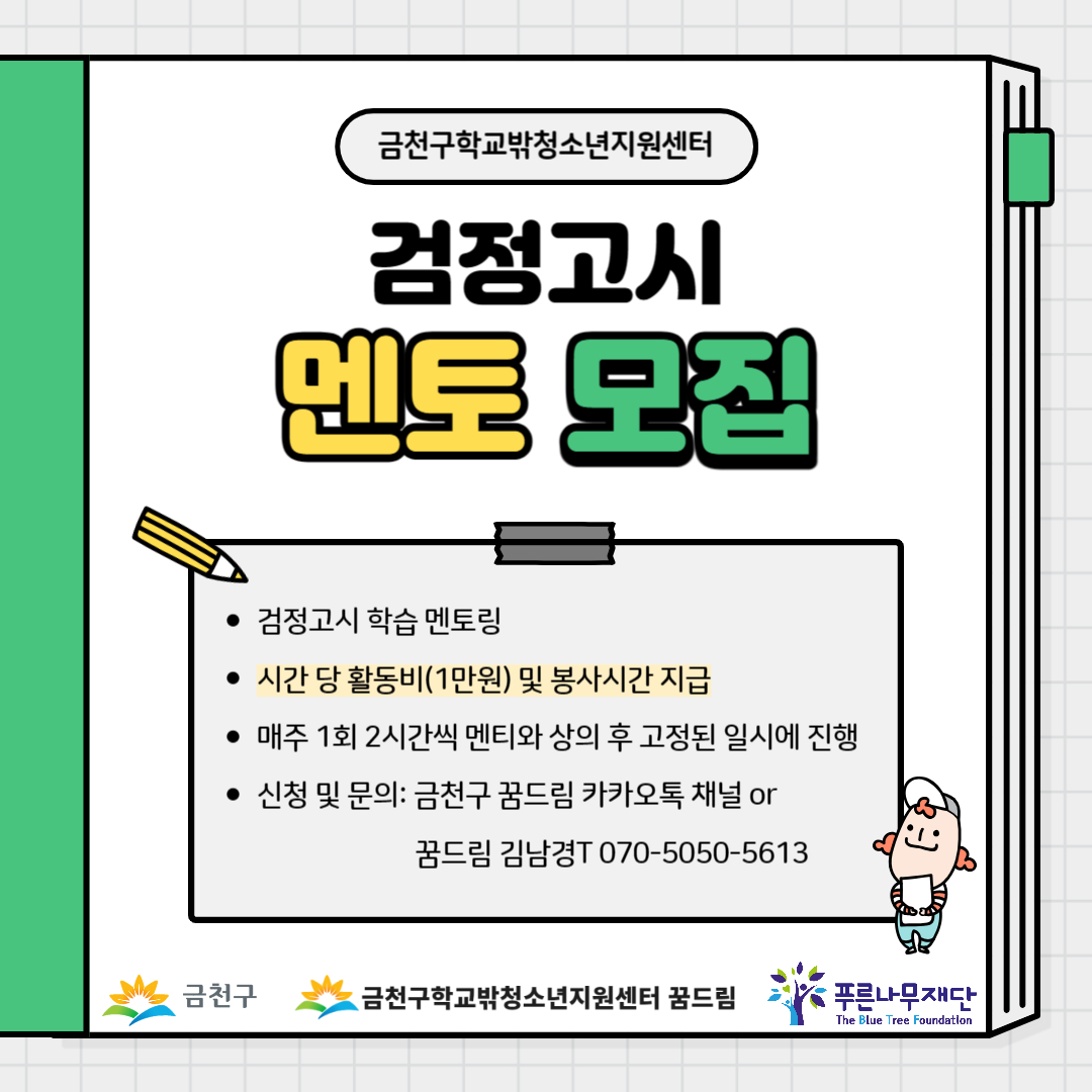 *검정고시 학습 멘토링*시간 당 활동비(1만원) 및 봉사시간 지급*매주 1회 2시간씩 멘티와 상의 후 고정된 일시에 진행*신청 및 문의: 금천구 꿈드림 카카오톡 채널 or 꿈드림 김남경T 070-5050-5613