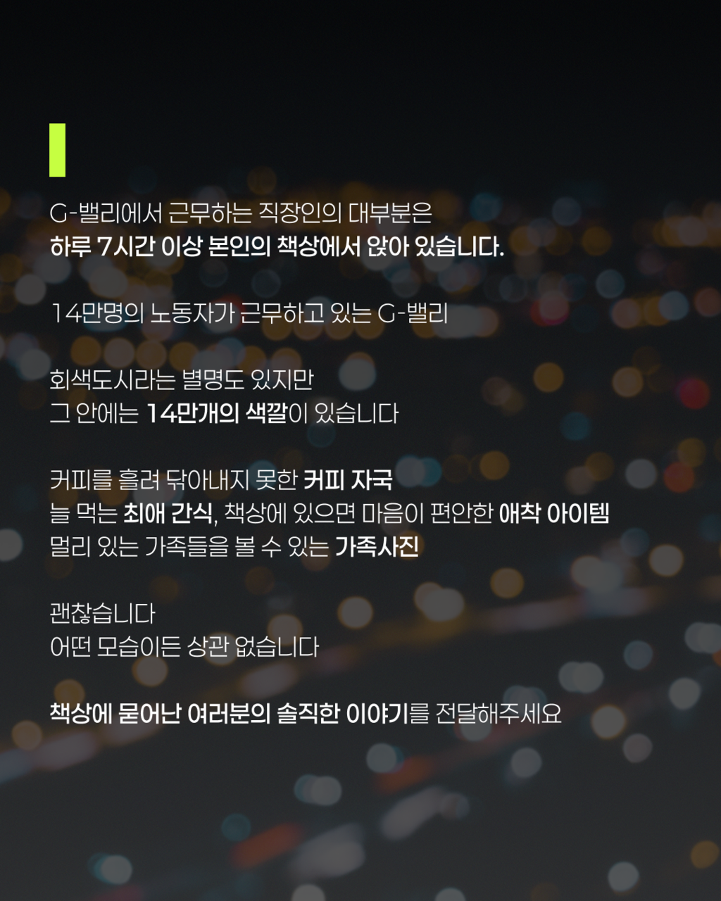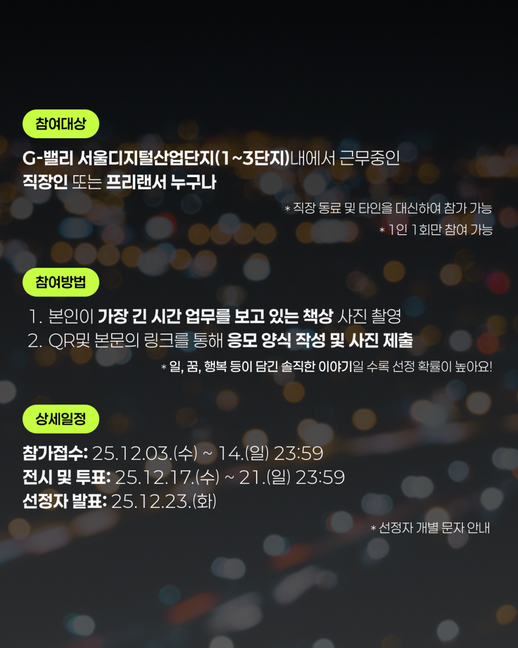 - 참여 대상 : G밸리 서울디지털산업단지 (1~3단지) 내에서 근무중인 직장인 또는 프리랜서라면 누구나 가능