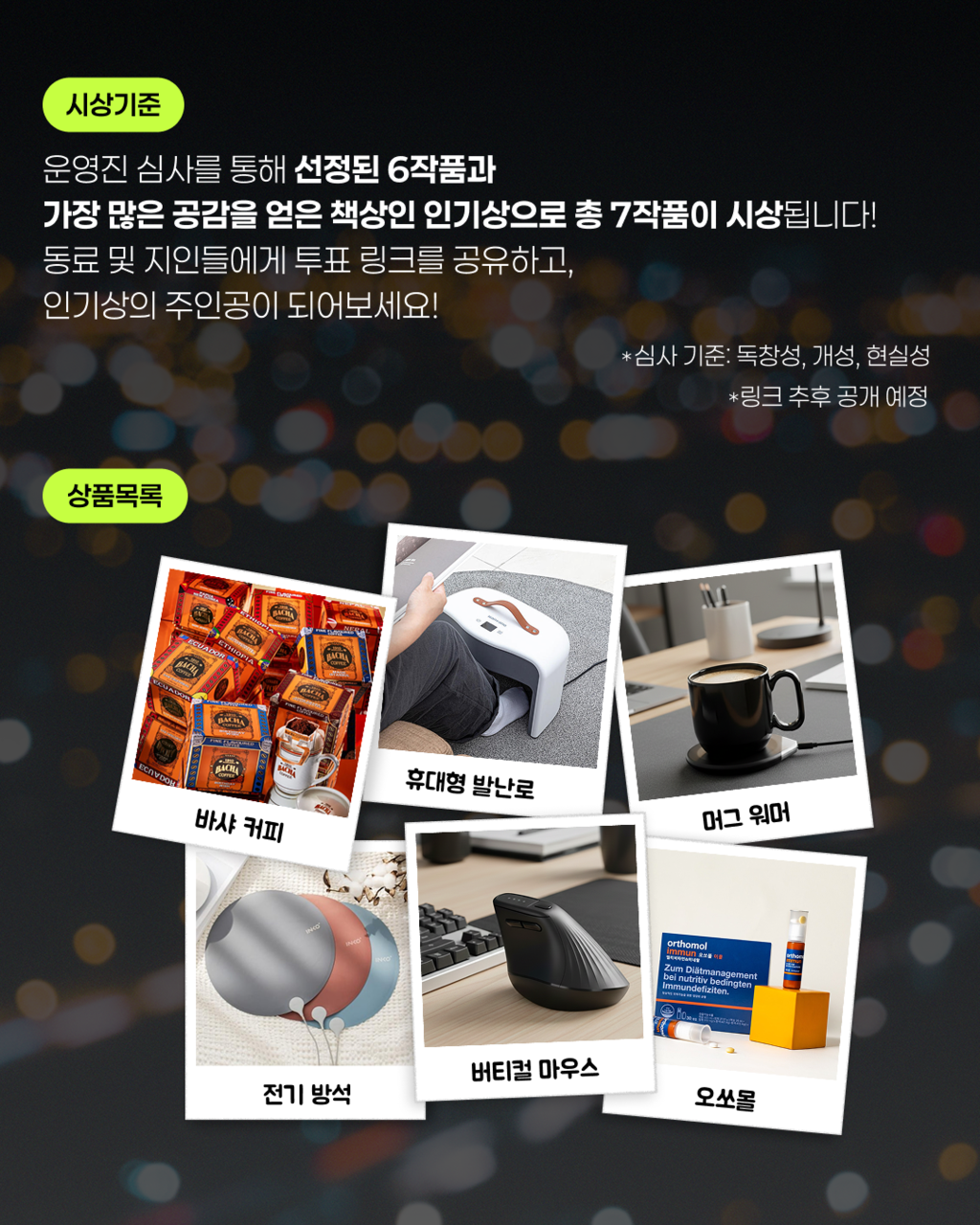 *선정작 6개는 심사 기준을 통해 선정되며, 추후 온라인 투표를 통해 인기작 1개가 선정됩니다. 온라인 투표 링크는 추후 문자로 전달될 예정입니다.