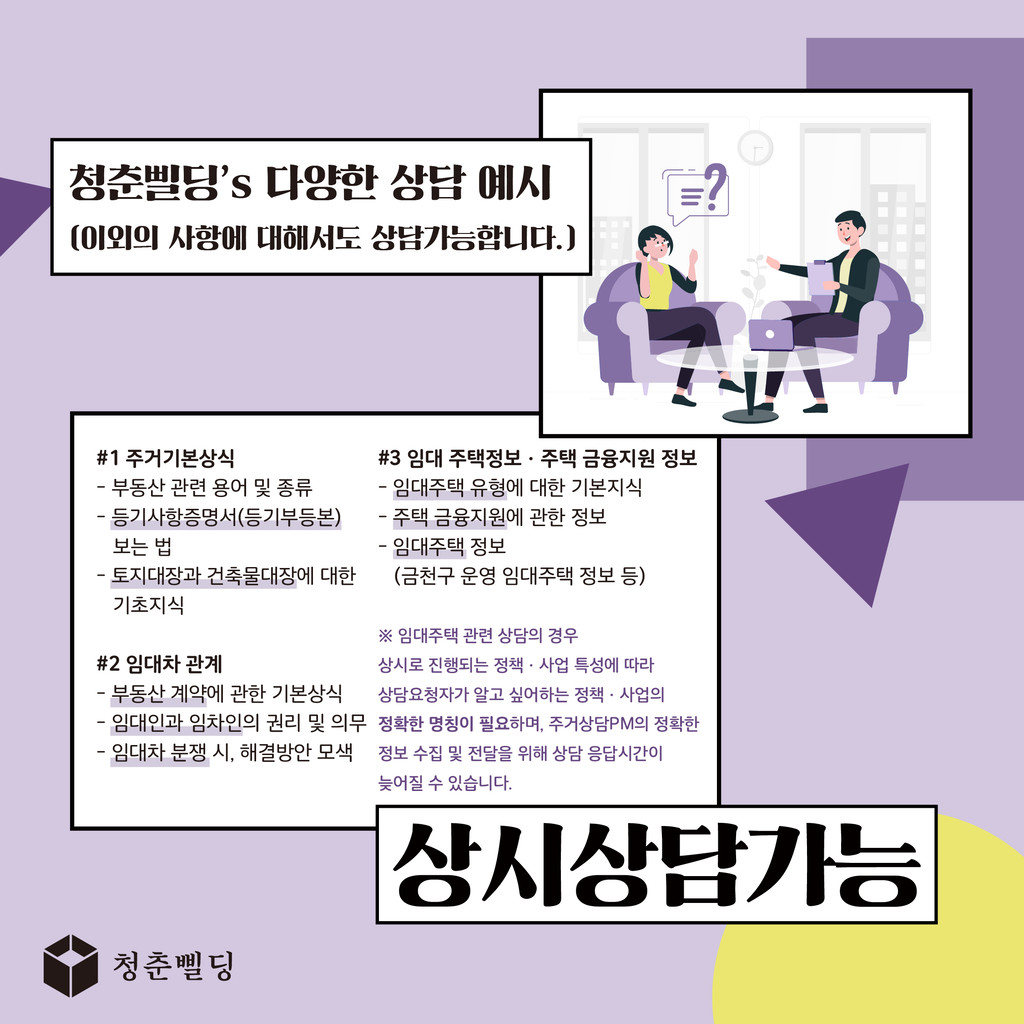 ※온라인상담, 유선상담, 대면상담 모두 카톡채널'금천청년주거상담'으로 사전예약 부탁드립니다:D