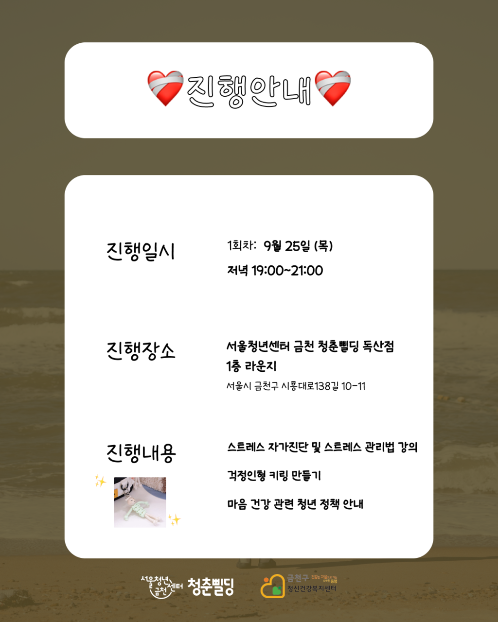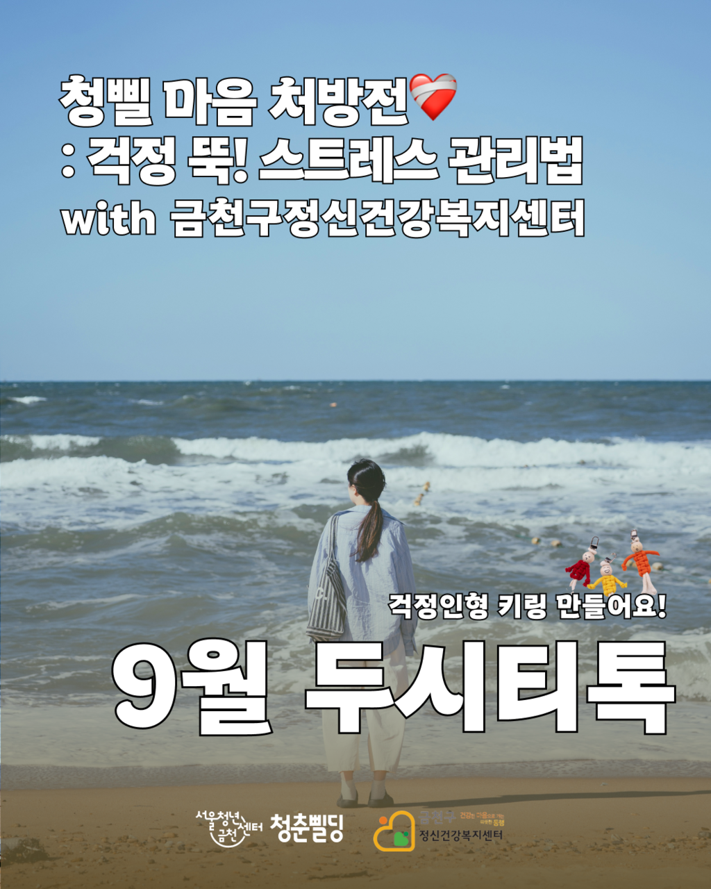 이번 기회에 금천구정신건강복지센터와 함께 번아웃과 스트레스 관리법에 대해 배우고, 걱정인형 키링도 만들어 보는 시간을 가져봐요!