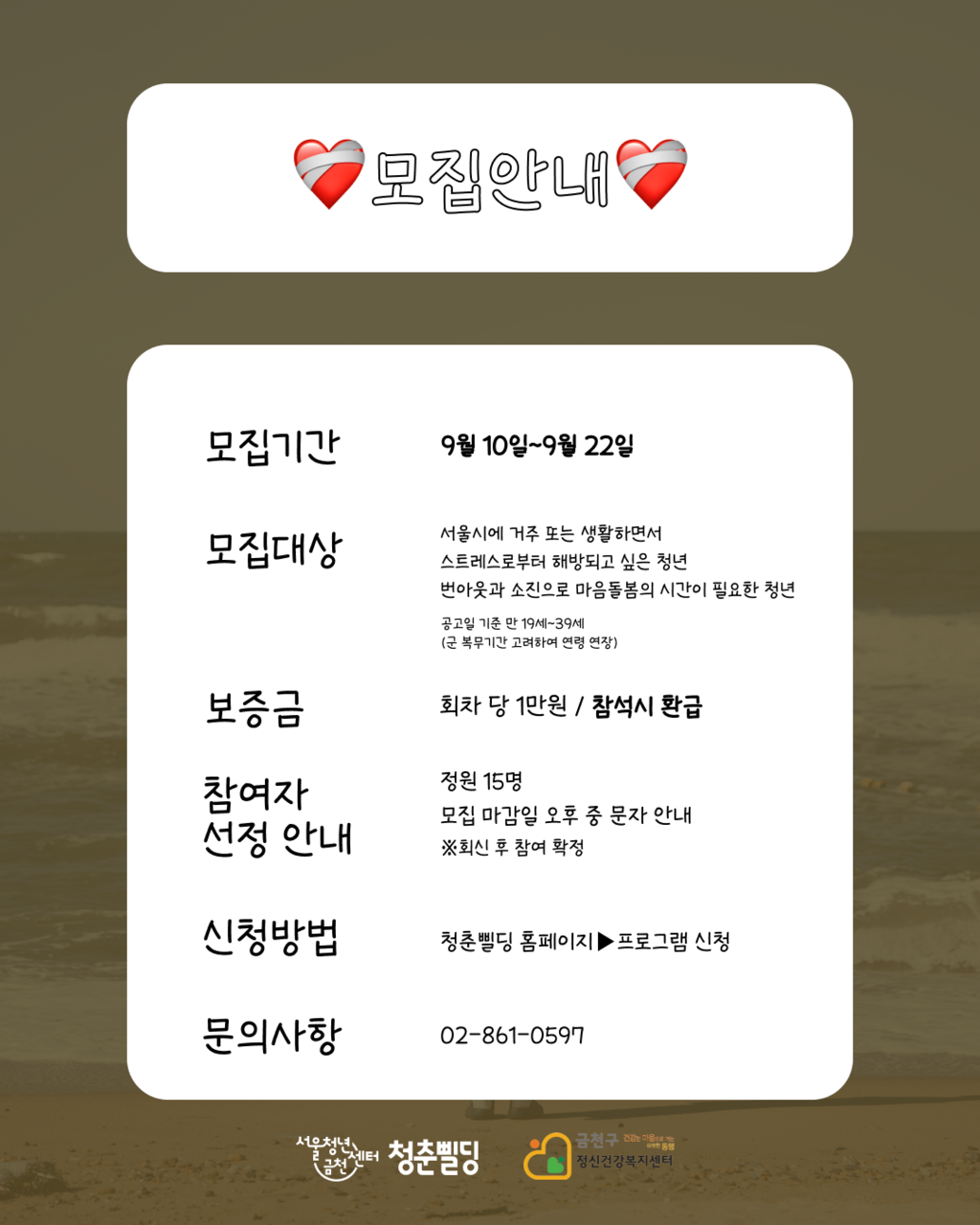 - 신청방법: 청춘삘딩 홈페이지 로그인->프로그램 신청
