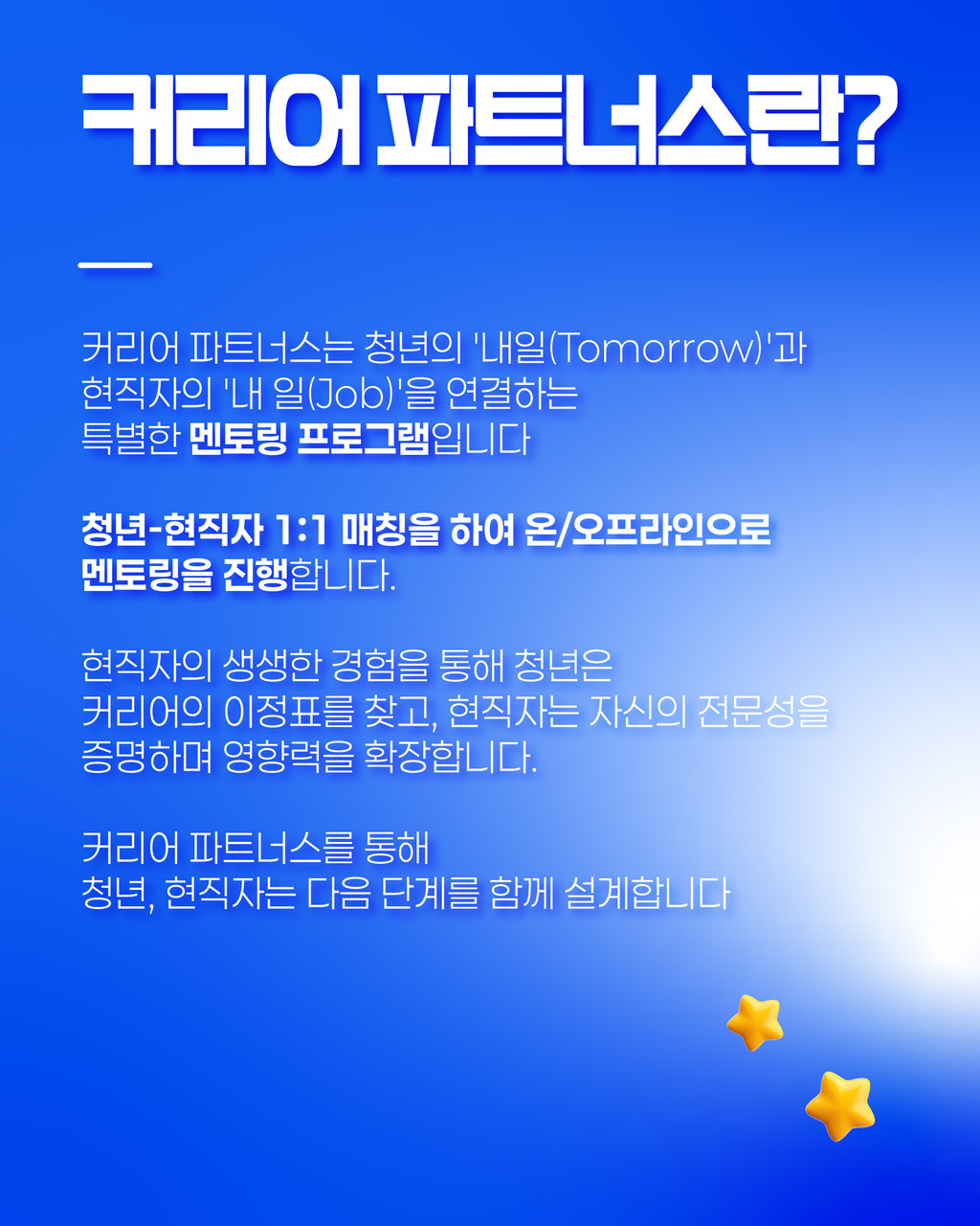 커리어 파트너스는 현직자의 생생한 경험을 통해 청년의 ‘내일(Tomorrow)’과 현직자의 ‘내 일(Job)’을 연결하는 특별한 멘토링 프로그램입니다.