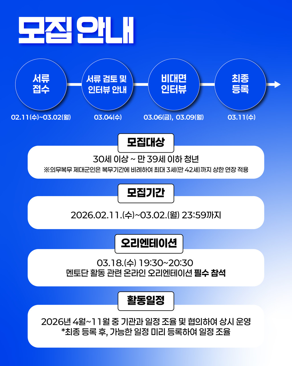 - 모집 기간 : 2026. 02. 11.(수) ~ 03. 02.(월) 23:59까지(*기간 외 접수 불가)