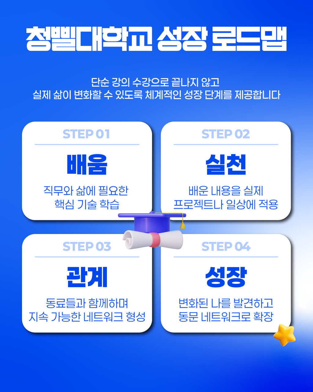 혼자가 아닌 함께 성장하는 즐거움을 느끼고 싶다면, 지금 바로 청삘대학교의 문을 두드려보세요!✨