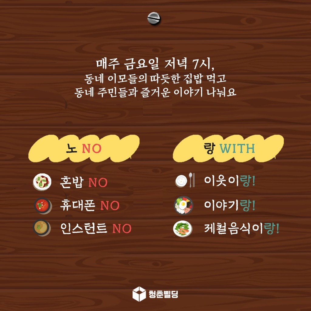 2. 노(NO)랑(WITH)식탁 - 혼밥 NO! 휴대폰 NO! 인스턴트 NO! - 이웃이랑! 이야기랑! 제철음식이랑! |