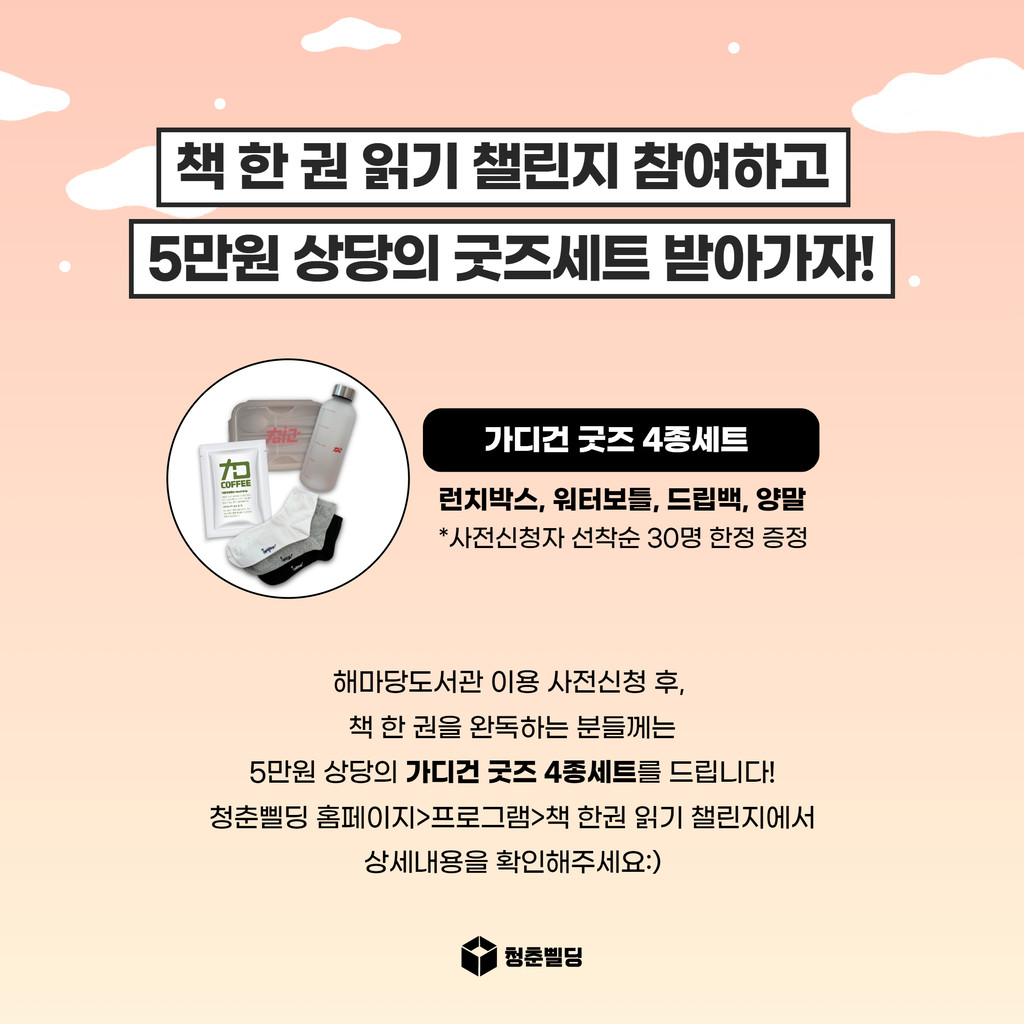책 한권 완독 및 미션까지 수행한 사전신청자에게는 5만원 상당의 가디건 굿즈 4종 세트를 드립니다