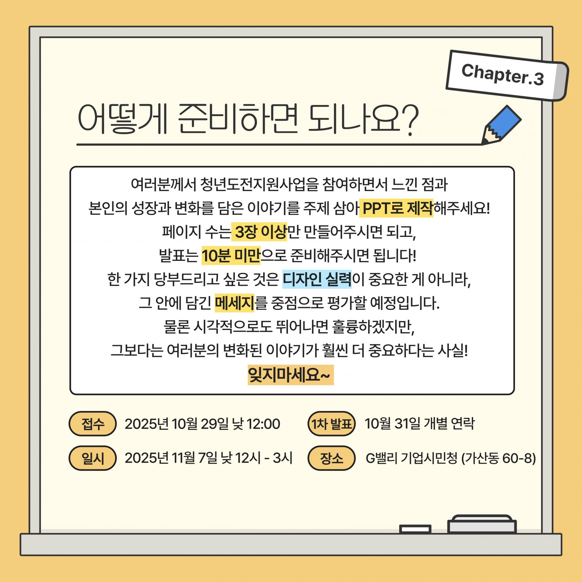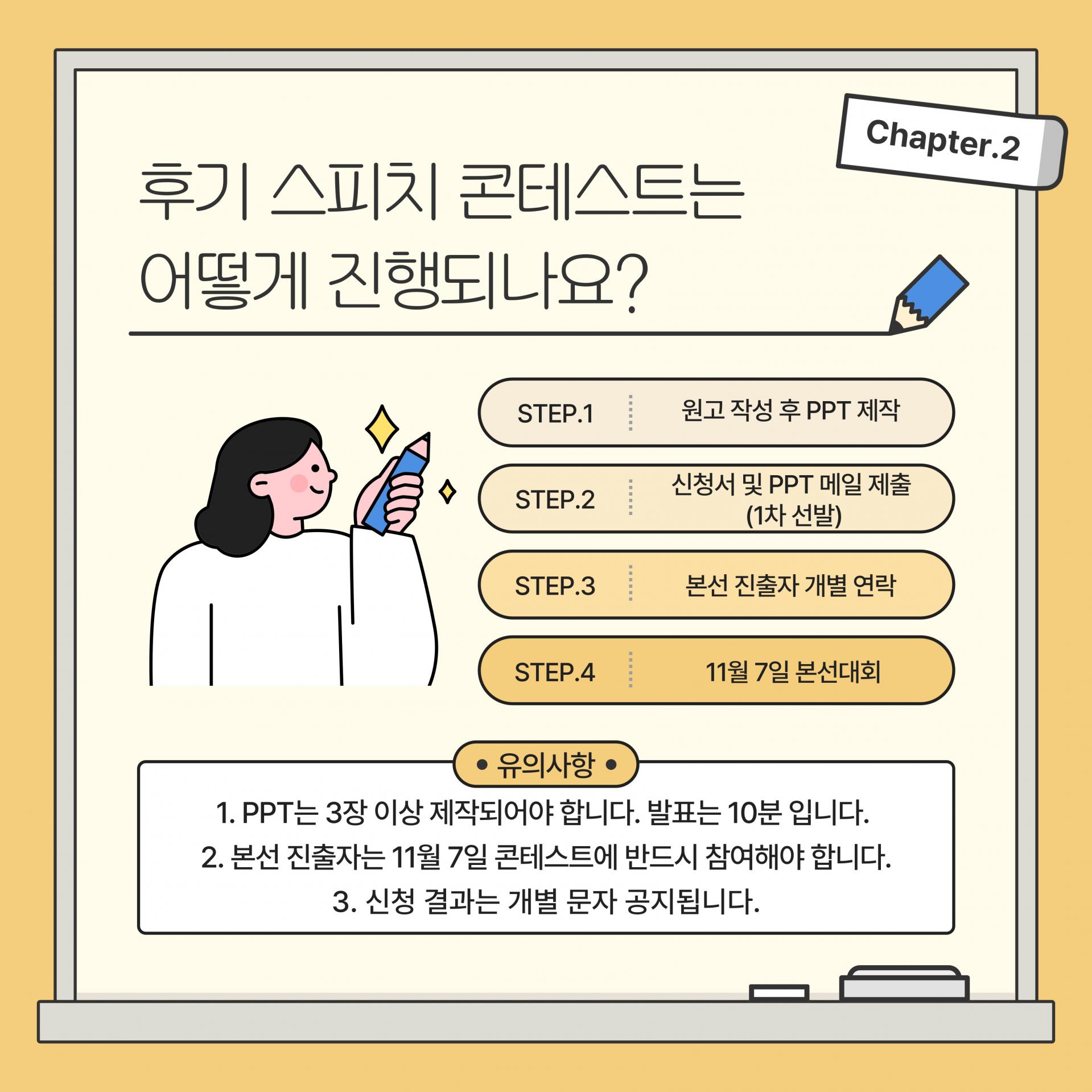 - 본선 : 11월 7일(금) 12:00 ~ 15:30 *10분 내 스피치