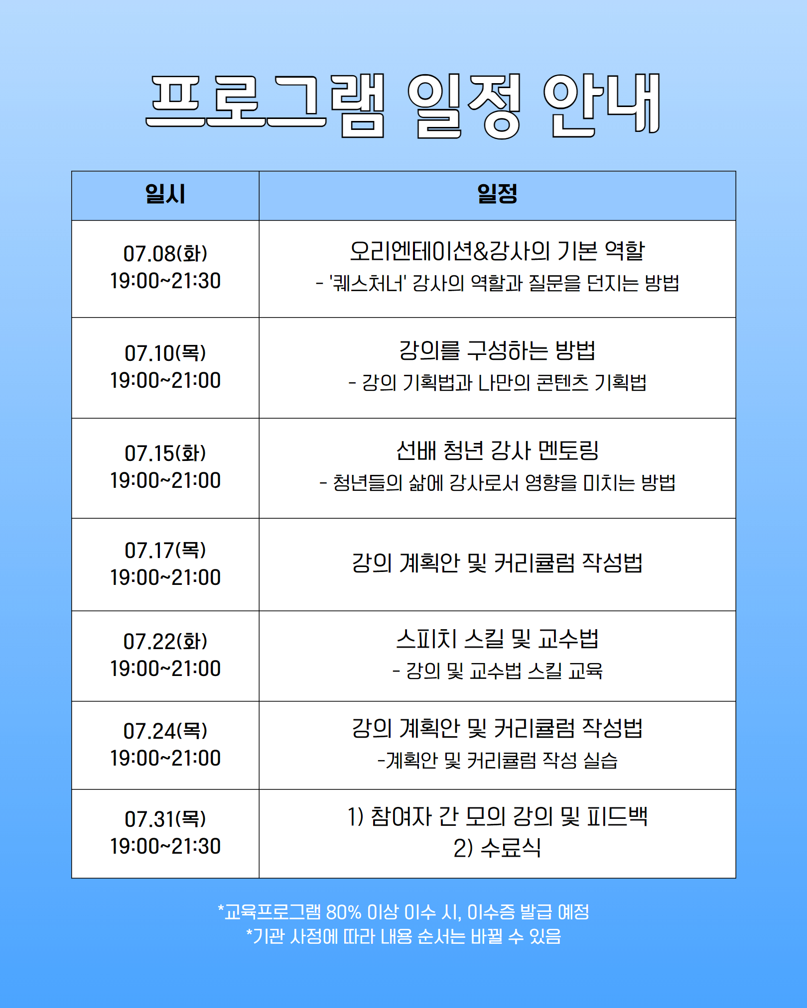 - 교육 기간 : 2025. 7. 8 (화) ~ 7. 31 (목) 19:00~21:00